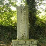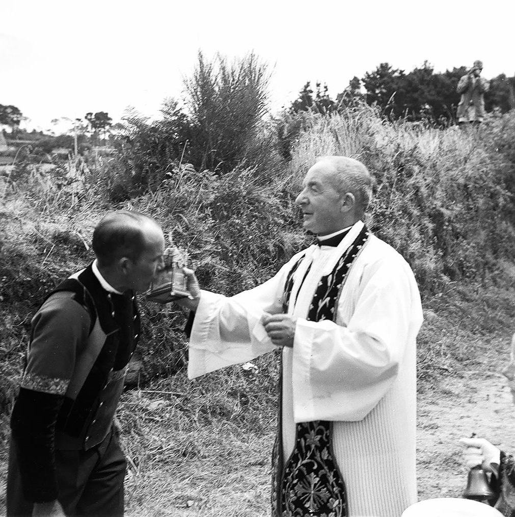 Cette Station, dédiée au patron de l'église de Kerlaz était autrefois située aux carrefours de deux routes à la limite de Locronan et de Plonévez-Porzay. Le film de 1929 montre que les pèlerins venant de Locronan contournaient la grosse pierre trouée que l'on voit sur la gauche de la photo de droite ci-dessous, c'est cette pierre qui à été réutilisée pour le socle de la croix actuelle. La chapelle Saint-Gemain détenait, outre la statue du saint, son petit reliquaire.