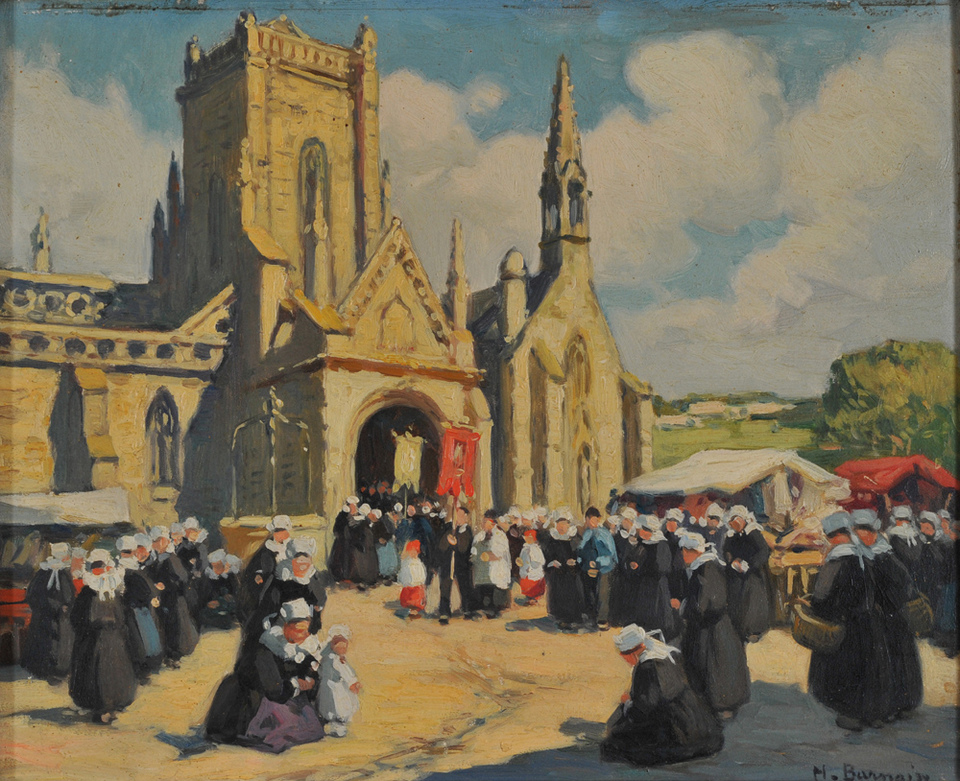 Henri BARNOIN (1882-1940) « Devant l'église » en Bretagne, Huile sur toile, signée en bas à droite, 62 x 80 cm