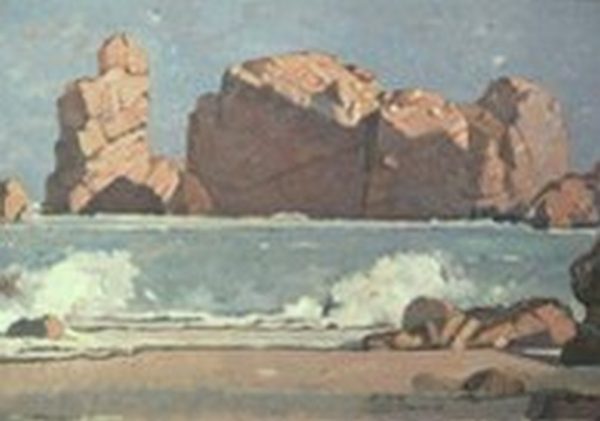 De 1922 à 1968, l’auteur a effectué 34 traversées transatlantiques en paquebot ; ses esquisses très finalisées sur de petits panneaux bois étaient facilement transportables dans ses malles-cabines. Ici, exemple de la série d’esquisses en petit format prises in situ chaque été en Trégor en vue d’agrandissements sur toile dans l’atelier new-yorkais à destination des commanditaires américains