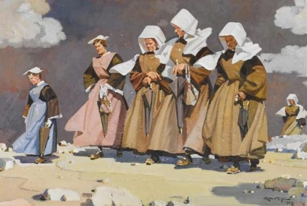 Composé dans l’atelier new-yorkais du peintre d’après esquisses à échelle réduite au retour d’une de ses villégiatures annuelles en Bretagne. Acquis en 1938 au Salon des Artistes Français du Grand Palais à Paris pour les Collections Royales britanniques