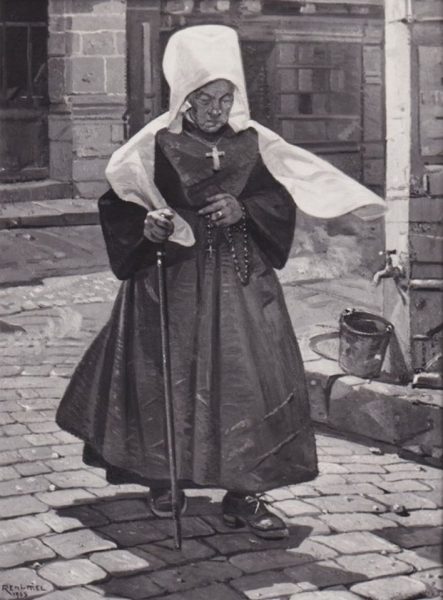 Reni-Mel (1893-1984) « Vieille bretonne dans les rues de Lorient » 1955 Huile sur toile sur chassis [Cat.n°248] 110x80 cm.