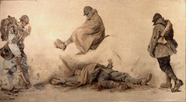 Œuvre réalisée en 1915, année où Reni-Mel, après être passé par Joinville sous l’uniforme de la préparation militaire à l’École militaire, va rejoindre le front de Champagne, sans lâcher ses crayons et pinceaux. Sur le terrain, il poursuivra à chaque occasion de liberté, sa pratique de captation « sur le motif », des combats et de leurs effets immédiats sur les hommes, les bêtes et des paysages ravagés.