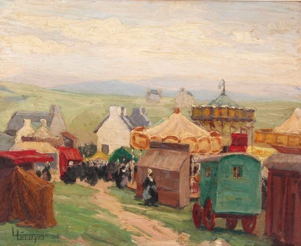 Louis Lécuyer (1903-1976) - « Fête foraine en pays bigouden, jour de Pardon à Ste Anne la Palud », huile sur panneau, signée bas gauche, et datée « 32 », située et redatée au dos, indication « Exposition de Tunis 1935 » et « Salon Artistes Français 1935 », 33 x 41 cm