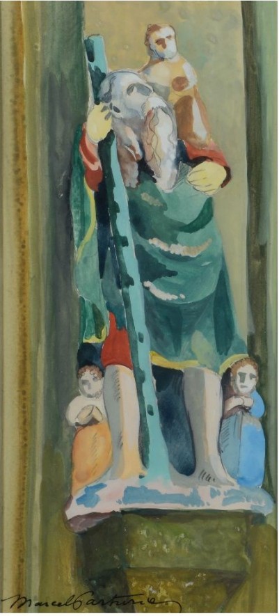 « Un Saint Polychrome dans l'église de Locronan », Aquarelle, signée en bas à gauche et titrée au dos 26.5 x 12.5 cm.