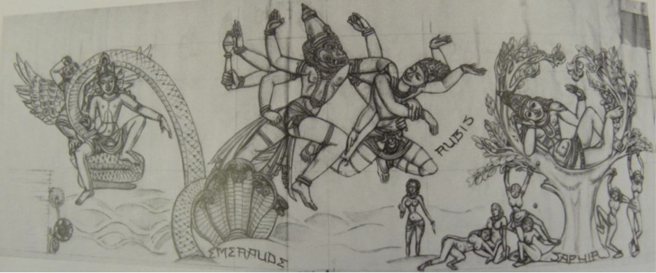 - le décor extérieur du Pavillon de la joaillerie où l’artiste choisit d’illustrer des légendes indiennes sur la naissance des pierres précieuses :
