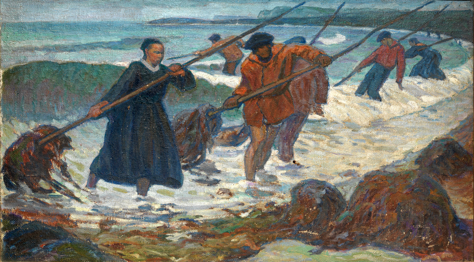 Paul Vigoureux (1876-1954) - Catalogue d’ouverture du musée de Locronan en 1934, en n°59 « Tireurs de Goëmon », huile, signée en bas à droite, 68x121 cm